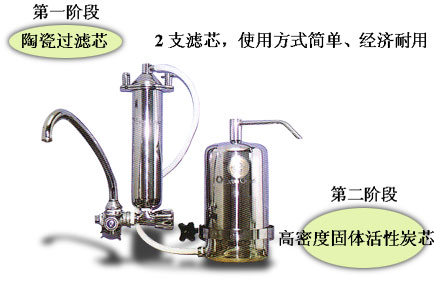 自来水经过陶瓷过滤芯,水中杂物和细菌由于体积较大而被隔除,完成处理的第一阶段。水进入高密度活性炭芯进行第二阶段工作。高密度活性炭芯拥有四层过滤模(人造丝4-5微米和人造丝2-3微米→活性炭心过滤柱→post-filter),提供无数微孔,增加与水的接触面,吸收残留的污染物,消除水中异味和臭味,以营造干净和含矿物质的食水。